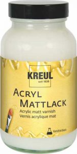 Kreul Acryl Mattlack auf Kunstharzbasis 250 ml Damit kleine und große Kunstwerke vor Schmutz und Nässe geschützt werden, kommen die Kreul Überzugslacke zum Einsatz. Transparent und wasserfest werden sie auf Oberflächen aufgetragen, die bereits durchgetrocknet sind und nachhaltig versiegelt werden sollen. Sie können auf viele Untergründe aufgetragen werden, sind speichelecht und in den Effekten glänzend, matt oder seidenglänzend erhältlich.