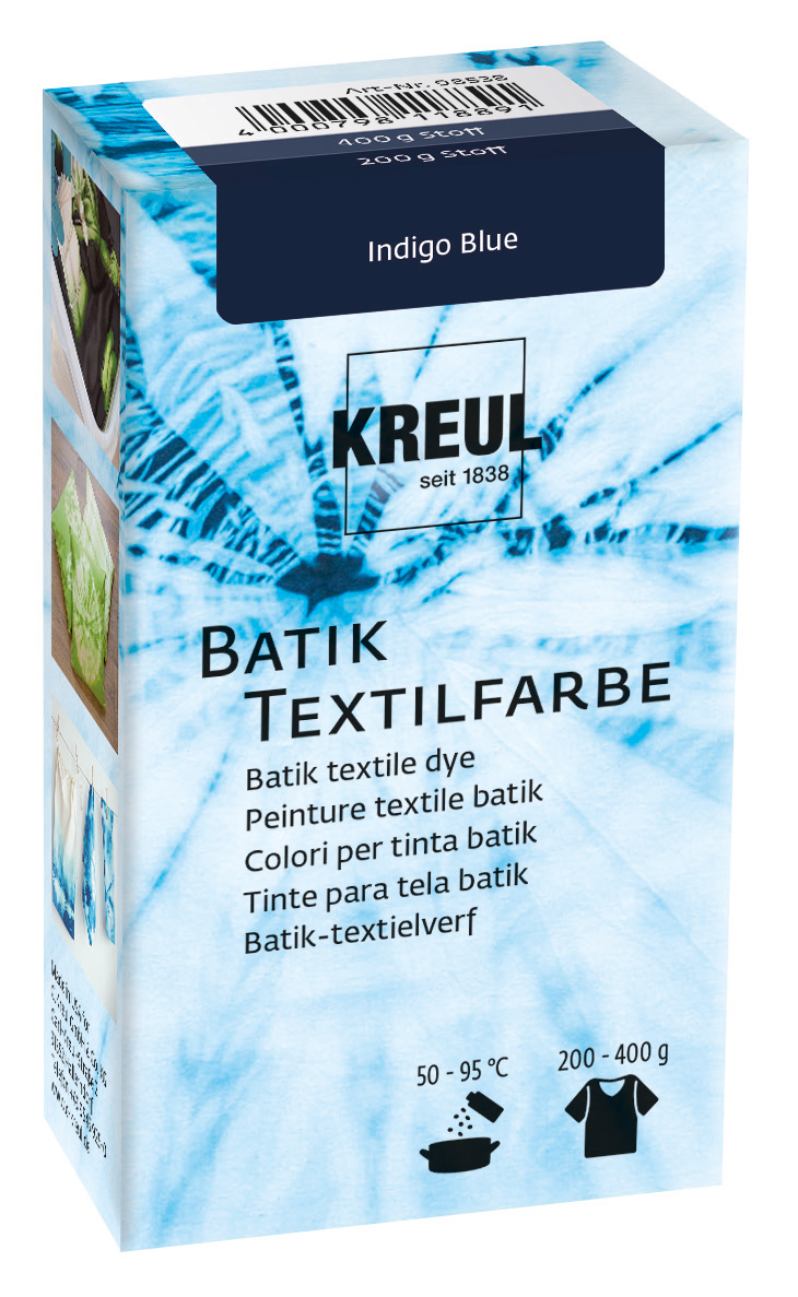 Batik-Textilfarbe zum Färben und Batiken von Textilien. Färbt ab 50 °C bis 95 °C in einem Eimer oder auf dem Küchenherd in einem Kochtopf. Bei Verwendung des 70 g Farbpulvers (siehe Verpackungsetikett): Kräftige, intensive Färbung bei 200 g Stoff, Mittlere Färbung bei 400 g Stoff. Für Seide, Baumwolle, Viskose, Leinen, Halbleinen, Wolle, Polyamid. Gebrauchsfertiges Farbpulver inklusive Färbesalz. In der praktischen Flasche für optimale Dosierbarkeit und Aufbewahrung. Ideal für Stoff-Färbetechniken wie Shibori (Abbinden, Falten, Knoten) und Dip-Dye (Tauchfärben), niedrige Färbetemperatur von 50 °C ermöglicht Wachsbatiken und Tie Dye-Färbetechniken mit Spritz- und Sprühflaschen. Gefärbte Textilien sind nicht kochecht Beim Waschen hellt der Stoff auf. KREUL Fixiermittel für Batik-Textilfarben (Nr. 98553) verbessert die Waschbeständigkeit. Gefärbte Textilien separat und bei max. 40 °C waschen. Beachten: Farbige Textilien vorab entfärben