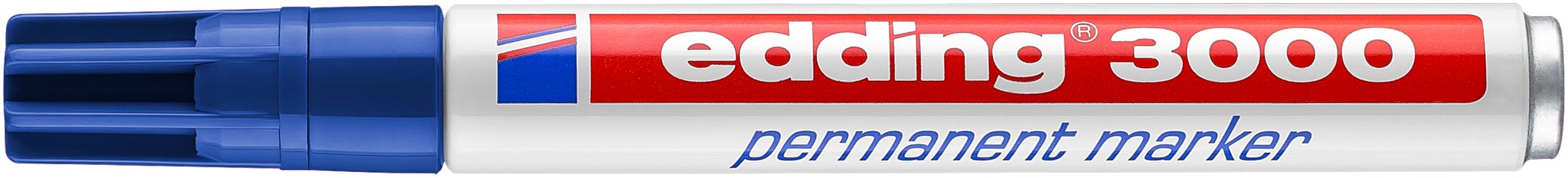 Permanentmarker edding 3000. Nachfüllbarer Marker zum Beschriften, Bemalen, Kennzeichnen von fast allen Materialien, auch Metall, Glas, Kunststoff. Permanente, geruchsarme Tinte ohne Zusatz von Toluol/Xylol, wisch- und wasserfest, lichtbeständig. Austauschbare Rundspitze. Aluminiumschaft. Umsteckbare Kappe in Schreibfarbe. Schaftfarbe: weiß . Strichstärke: ca. 1,5 – 3 mm.