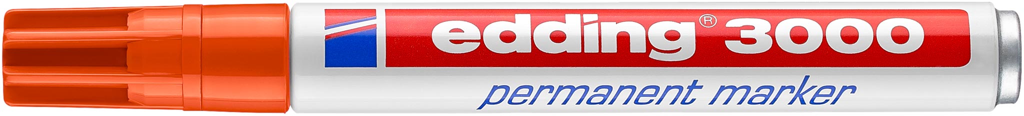 Permanentmarker edding 3000. Nachfüllbarer Marker zum Beschriften, Bemalen, Kennzeichnen von fast allen Materialien, auch Metall, Glas, Kunststoff. Permanente, geruchsarme Tinte ohne Zusatz von Toluol/Xylol, wisch- und wasserfest, lichtbeständig. Austauschbare Rundspitze. Aluminiumschaft. Umsteckbare Kappe in Schreibfarbe. Schaftfarbe: weiß . Strichstärke: ca. 1,5 – 3 mm.
