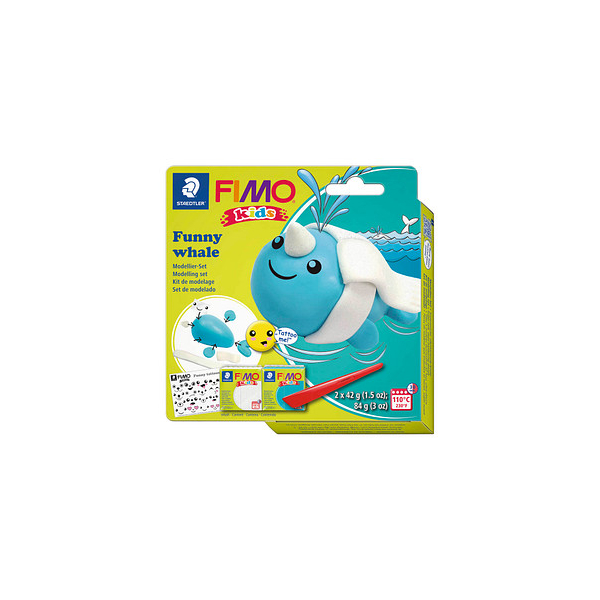 Set whale mit 2 Blöcken à 42 g (türkis, glitter weiß), Modellierstab, FIMO kids Tattoobogen