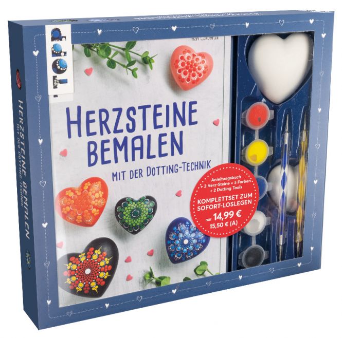 Mit diesem Komplett-Set zum Sofort-Loslegen entstehen einzigartige Herz-Steine mit Wow-Effekt. Dabei ist kein Vorwissen und keine gesonderte Maltechnik nötig, sodass schnell und einfach individuelle Ergebisse erzielt werden. Durch das beiliegende Buch mangelt es auch nicht an Inspiration, sowohl für die Herzsteine, als auch für runde Steine. Ein perfektes und persönliches Geschenk nicht nur für Valentinstag, Muttertag, oder Hochzeiten.
