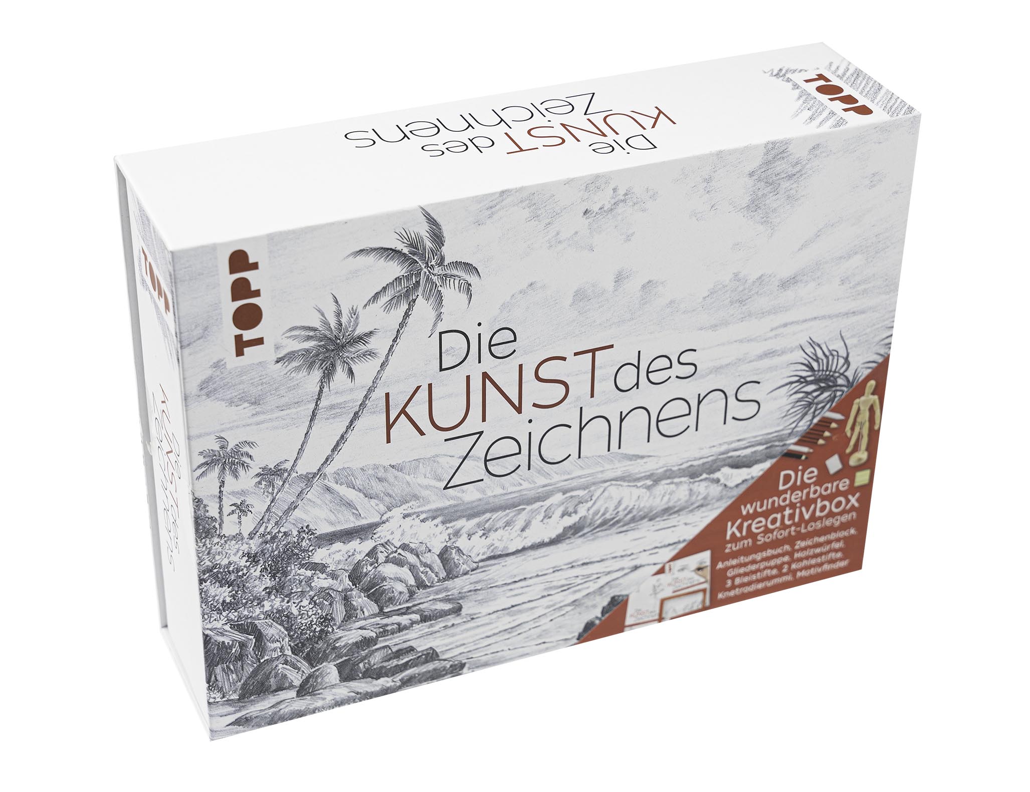 Das exklusive Geschenk-Set für alle Zeichenfans. Dieses Komplett-Set ist das perfekte Geschenk für den Start in die wunderbare Kunst des Zeichnens und beinhaltet alle wichtigen Zeichenutensilien in einer schönen Geschenkbox! In der wertigen Box enthalten ist: – eine Grundanleitung für die ersten Schritte mit Erklärungen zu Material, Skizzen anfertigen, Schraffierung und Potraits zeichnen. – Skizzenblock, – 3 Bleistifte (H, B, HB), – 2 Kohlestifte in Schwarz und Weiß, – 1 Papierwischer, – 1 Knetradiergummi, – 1 Holzwüfel, – 1 Gliederpuppe
