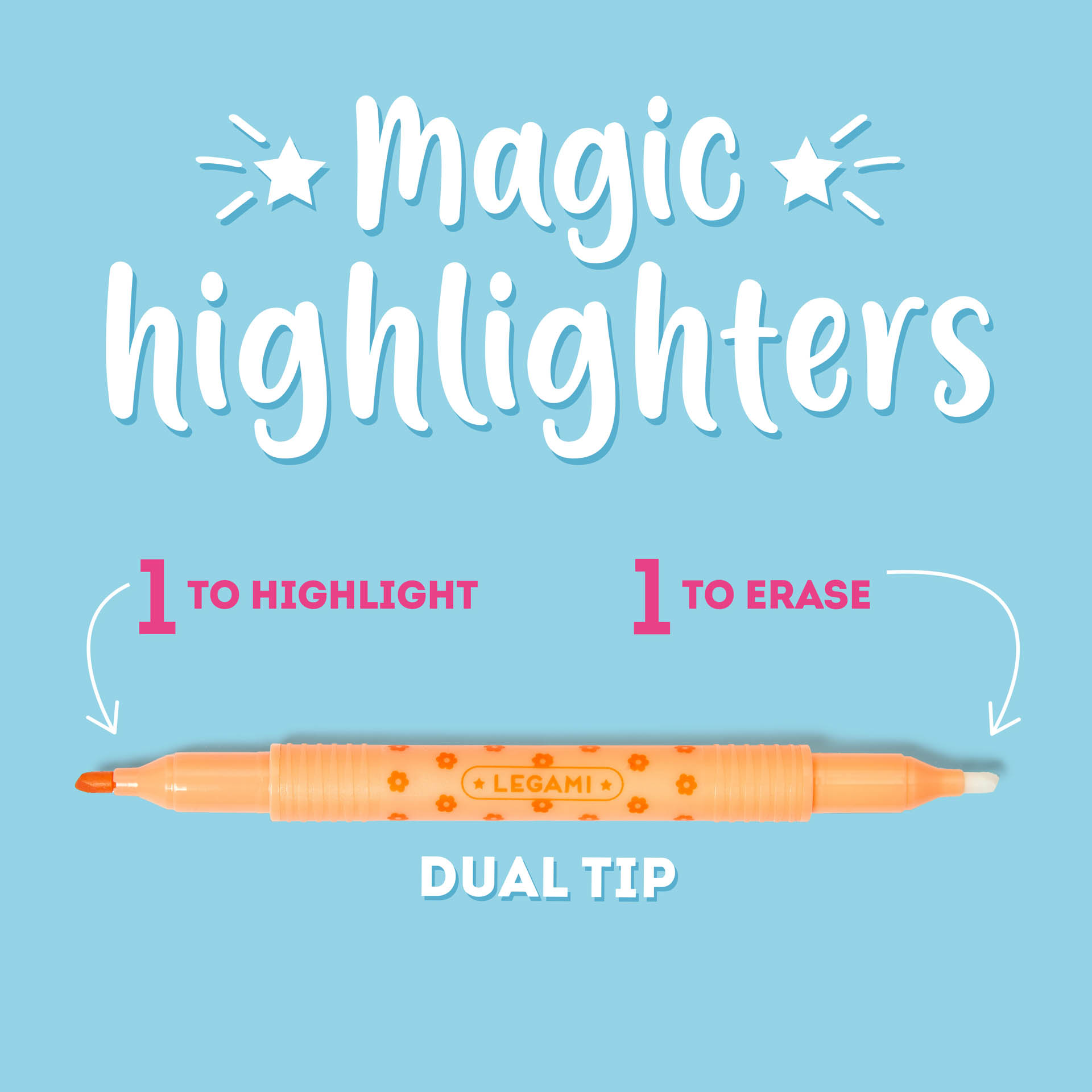 Was dir gestern noch wichtig erschien, spielt heute keine Rolle mehr? Nun, die Prioritäten ändern sich. Deshalb ist es immer gut, das Set mit 6 löschbaren Textmarkern – Magic Highlighters von Legami zur Hand zu haben. Jeder Marker hat eine doppelte Spitze: Du kannst eine Spitze zum Unterstreichen und Hervorheben verwenden und wenn du deine Meinung änderst, drehst du sie einfach um und verwendest die zweite Spitze zum Radieren.