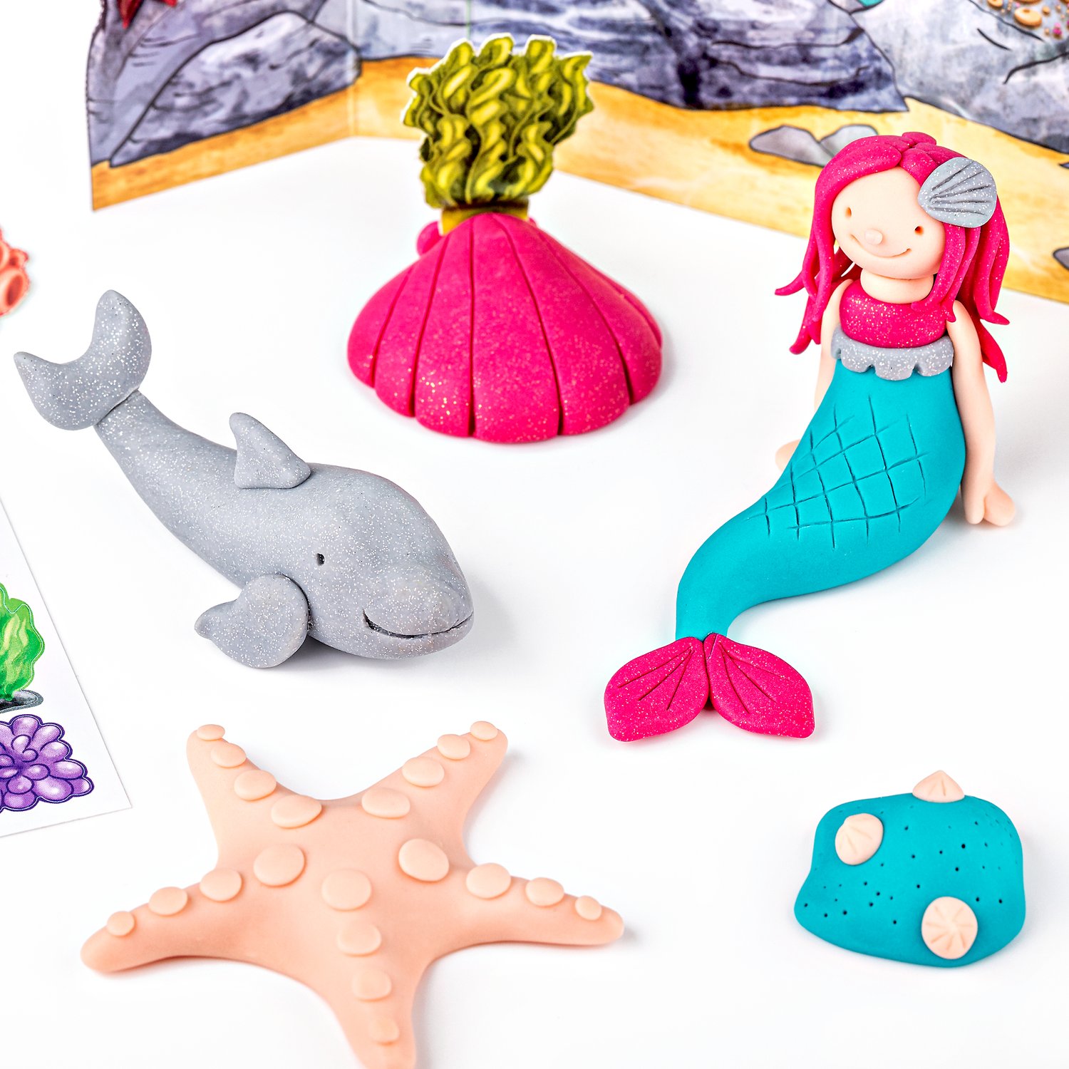 Buntes Modelliermasse-Set für Kinder zum Gestalten einer zauberhaften Meerjungfrau. Die weiche FIMO Kids Knete lässt sich leicht formen und härtet im Ofen dauerhaft aus. Ideal für kreative Bastelstunden.
