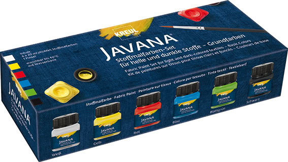 Ideal für Einsteiger, da das Set die wichtigen Basisfarben beinhaltet, die man zum Malen braucht. Cremige, brillante Stoffmalfarben mit pastosem Charakter Hochdeckende Farbtöne. Auf Wasserbasis, lichtecht. Geeignet für Stoffdruck und Schablonieren. So gehts: Textilien vor dem Bemalen appretur- und weichspülerfrei waschen. Zum Schutz Backpapier zwischen die Stofflagen legen. Den bemalten Stoff nach einer Trockenzeit von 6 Stunden mit Backpapier abdecken und mit dem Bügeleisen bei Baumwolleinstellung 5 Minuten fixieren. Alternativ im Backofen den Stoff 8 Minuten bei 150 °C fixieren. Fixierte Textilien sind linksseitig bis 40 °C im Feinwaschgang waschbar. 6 Gläser à 20 ml in Weiß, Gelb, Rot, Blau, Blattgrün, Schwarz, 1 Pinsel