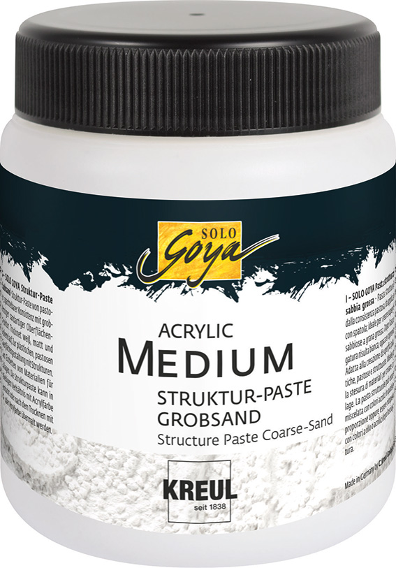 Mit der Acrylic Medium Struktur-Paste werden dreidimensionale Wirkungen erzeugt und Bildkompositionen auf Leinwand erhalten eine ansprechende Bildtiefe und große Ausdruckskraft. Neben der optischen wird auch eine haptische Erlebniswelt auf Leinwand erschaffen, wenn die Paste und Acrylfarben aufeinandertreffen. Struktur-Pasten sind zur plastischen, pastosen Oberflächengestaltung mit Strukturen geeignet, als Grundiermedium verwendbar, um unterschiedliche Untergrundstrukturen zu erzielen, für verschiedenartige Effekte einsetzbar und als Kleber für Collagen nutzbar. Die Paste auf Wasserbasis ist ideal für die Gestaltung mit dem Künstlermalmesser und für strukturreiche Aufträge mit dem Pinsel. Die Struktur-Paste Grobsand ist von pastoser, spachtelbarer Konsistenz mit grobkörniger sandartiger Oberflächenstruktur. Sie trocknet weiß, matt und deckend auf. Die Paste lässt sich mit Acrylfarbe in beliebigem Verhältnis mischen und kann nach dem Trocknen mit Öl- oder Acrylfarbe übermalt werden.