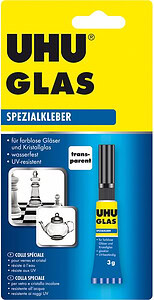 UHU GLAS reparaturkleber ist ein unter Tageslicht schnell aushärtender Spezialklebstoff für die Klebung von Glas und Kristallglas untereinander und auf Metall. Nach Aushärtung wasser- und spülmaschinenfest, UV-resistent und temperaturbeständig.