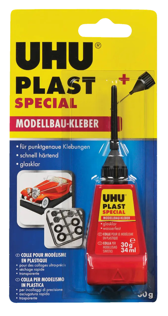 UHU plast spezial ist ein Spezialklebstoff zum Kleben von Polystyrol-Teilen und einer Vielzahl von anderen Kunststoffen im Modellbau. Die sehr feine Metallkanüle erlaubt einen sparsamen und punktgenauen Klebstoffauftrag, auch an schwer zugänglichen Stellen. Ein sehr dünnflüssiger Kleber, der einen zähelastischen, glasklaren Klebefilm bildet.